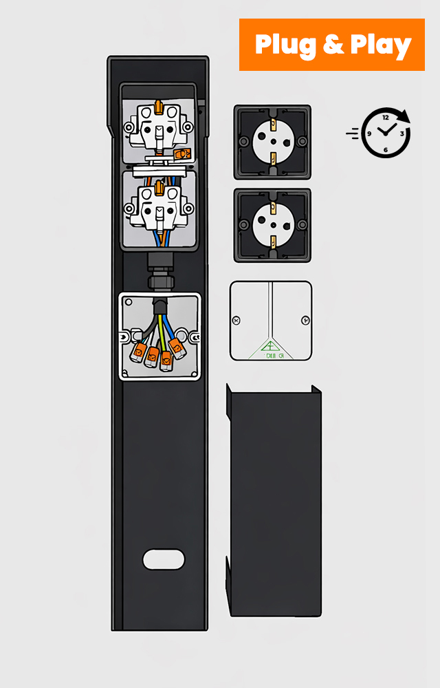 Het enige dat u als hovenier of installateur nog hoeft te doen is het aanvoeren van de grondkabel en het insteken van de juiste kleuren in de Wago klemmen. Meer niet. Op deze manier bespaart u tot vijftien minuten installatietijd per paal. Dat lijkt weinig, maar bij meerdere palen in een project loopt dit snel op.